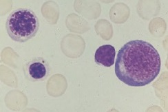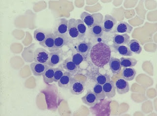 Plasmócitos: células raras na medula óssea normal, constituindo menos de 1% das células nucleadas, sendo ainda menos frequentes nas crianças saudáveis. São células de 15-20 μm de diâmetro, com núcleo excêntrico, citoplasma basófilo e uma zona de Golgi paranuclear proeminente. A cromatina apresenta proeminentes agregados. Ocasionalmente os plasmócitos podem apresentar 2 ou mais núcleos e podem aparecer em aglomerados celulares.