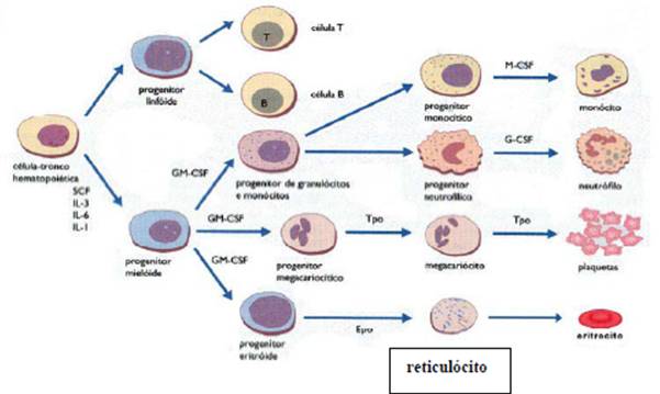 a) Eritropoiese: precursores dos eritrócitos são os eritroblastos que apresentam, pelo menos, 5 gerações celulares entre a stem cell eritróide morfologicamente não reconhecida e o eritrócito. Várias gerações de eritroblastos estão associadas a um macrófago, sendo o conjunto celular chamado de ilha eritroblástica
